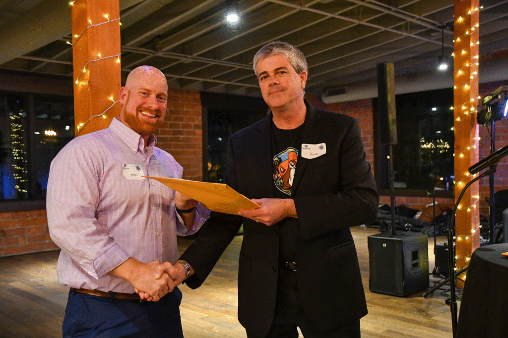 Principal Engineer and Treasurer Brent Siebenthal, P.E. handing the 2023 President’s Award to I&C Group Head Brian Price, PMP